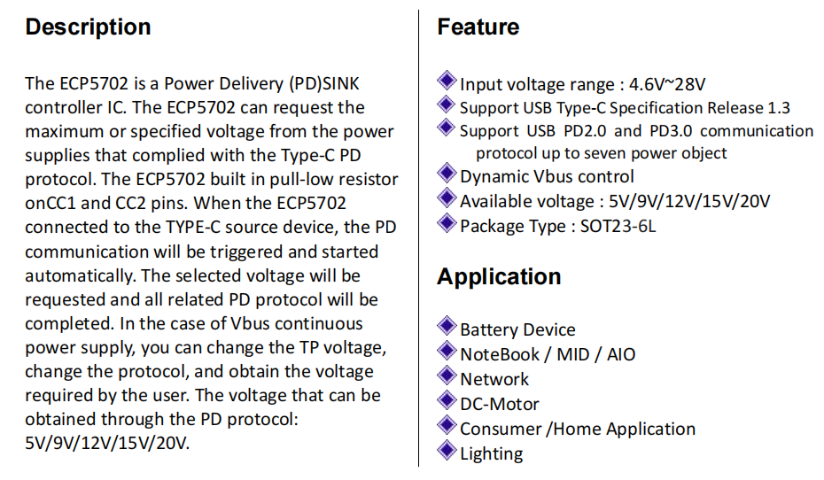 ECP5702是一款电力输送(PD)SINK 控制器IC。
